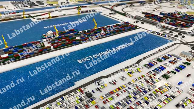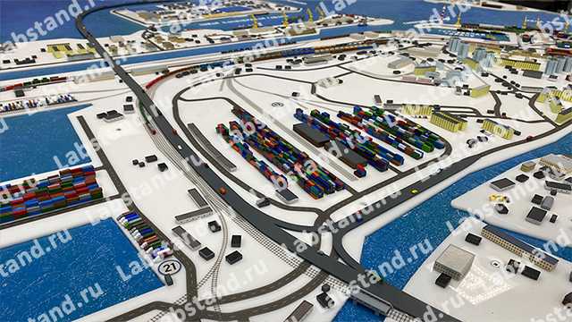 Интерактивный действующий макет для изучения общего расположения, устройства и логистики порта Санкт-Петербург – макет, состоящий из двух частей, с возможностью складывания и транспортировки, устанавливаемый на подмакетник с защитным бортом. Макет содержит в себе достоверное масштабное воспроизведение основных элементов и строение порта и портовой инфраструктуры объединенных общей дорожной сетью и коммуникациями. Макет должен иметь интерактивную подсветку, включаемую с компьютера, полностью синхронизированную с трехмерным виртуальным представлением изучаемого комплекса.