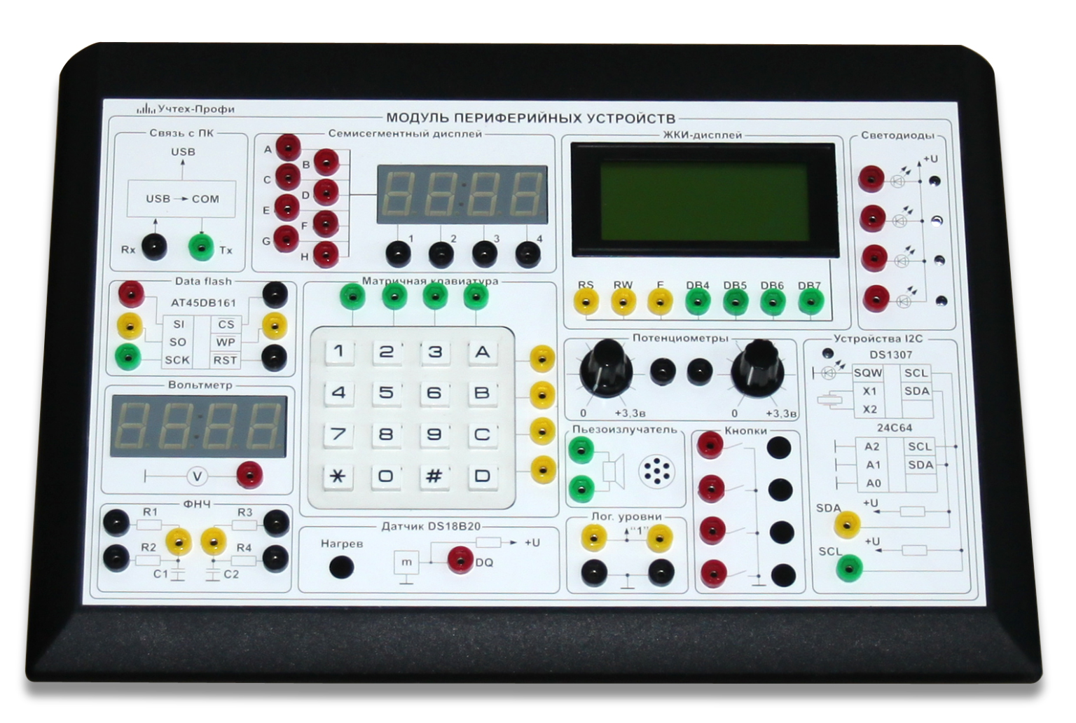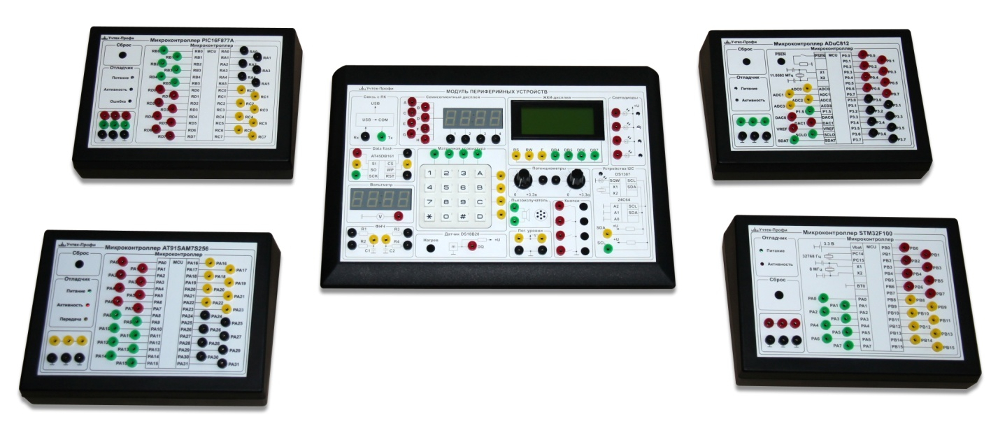 Поскольку микроконтроллеры рассматривать в отрыве от реальных устройств управления неуместно, в состав стенда входит модуль периферийных устройств, на котором смонтированы типовые устройства, подключаемые к микроконтроллерам. При выполнении лабораторных работ преследуется цель не просто изучить работу конкретного типа микроконтроллеров, а создать макет законченного устройства, к примеру, термометра или часов. Это на порядок увеличивает полезность стенда в учебном процессе.