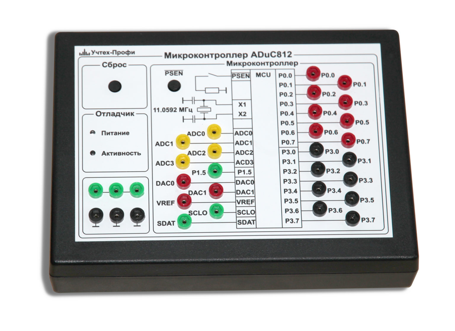 Модуль содержит микроконтроллер ADuC812 фирмы Analog Devices, некоторые из портов ввода-вывода которого доступны на лицевой панели. В модуле выполнена вся необходимая аналоговая обвязка, все входные и выходные антопоры защищены буферными операционными усилиями Rail-To-Rail. На лицевой панели выведена кнопка PSEN, предназначенная для входа в режим программирования микроконтроллера. Загрузка программы осуществляется через виртуальный COM-порт. Для программирования используется среда, допускающая программирование микроконтроллеров с ядром MCS-51. Модуль имеет кнопку сброса целевого микроконтроллера и светодиоды состояния.