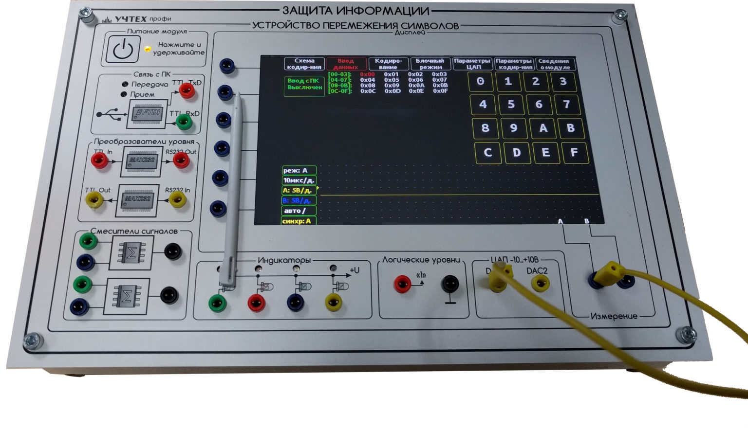 Стенд предназначен для проведения лабораторно-практических работ для студентов высших, средних и профессионально-технических учебных заведений с целью изучения процесс защиты информации в телекоммуникационных системах при наличии импульсных помех в канале передачи, путем использования процедур перемежения.
