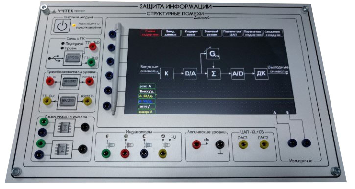 Стенд предназначен для проведения лабораторно-практических работ для студентов высших, средних и профессионально-технических учебных заведений с целью изучения влияния структурной помехи на достоверность приема информации при использовании простых и сложных широкополосных сигналов.