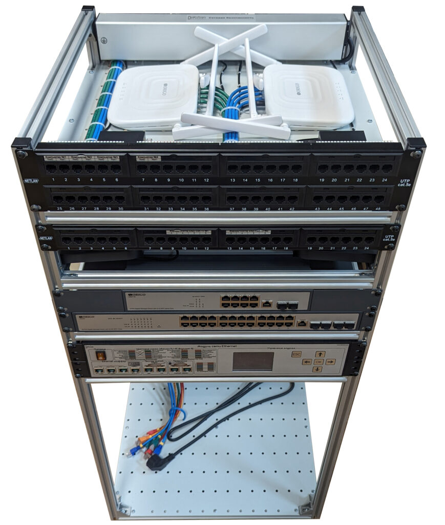 Коммутационная панель, входящая в состав стойки, позволяет коммутировать сетевые устройства в зависимости от выполняемых задач и формировать необходимую топологию сети.