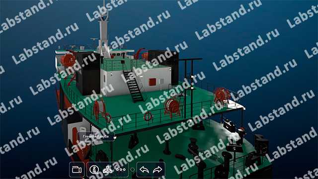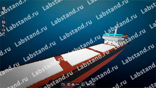 Трехмерная модель судна-сухогруза позволяет изучить конструкционные особенности судна, совершить прогулку в виртуальной реальности для более детального рассмотрения помещений и механизмов.