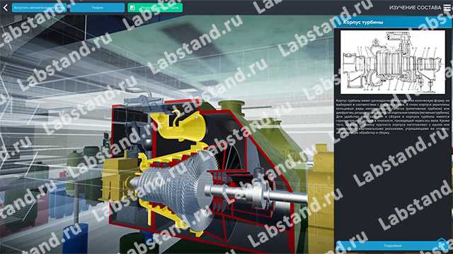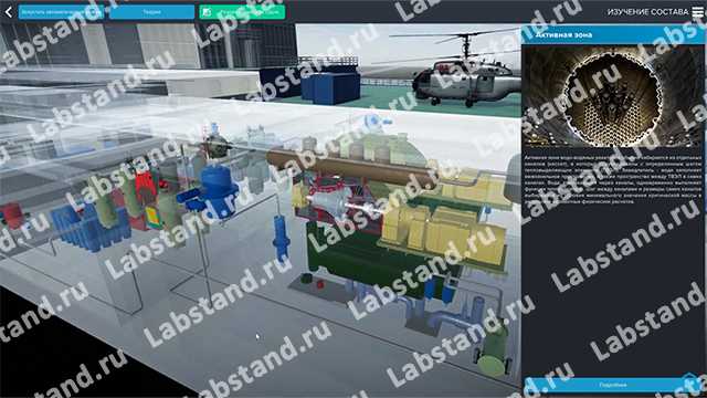 Виртуальный лабораторный стенд позволяет с помощью трехмерной графики и интерактивной анимации провести исследование конструкции, устройства и общих принципов построения водно-водяных ядерных реакторов используемых на различных суднах с ядерной силовой установкой. ПО также позволяет увидеть технологию процессов работы ядерной силовой установки и продемонстрировать процессы деления изотопов с выделением тепла с дальнейшим переходом к устройству парогенерирующей установки и паровой турбины как энергетического комплекса.