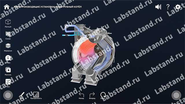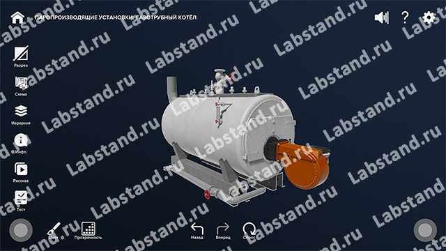 Виртуальный учебный комплекс обеспечивает подготовку специалистов судостроительной отрасли по различным специальностям в рамках дисциплин «Судостроение» и «Технология машиностроения». Специализированное программное обеспечение с помощью детальной трёхмерной графики и интерактивной анимации обеспечивает исследование принципа работы оборудования и систем судовых котлов и паропроизводящих установок. Стенд позволяет исследовать основные узлы и элементы установок, изучить их назначение и принцип действия, а также в реальном времени продемонстрировать их работу и изучить процессы, происходящие внутри отдельных узлов. Стенд содержит в себе трехмерные модели судовых котлов и паропроизводящих установок и их основных узлов, а также двухмерные анимированные схемы для иллюстрации их работы, а также энергетических и электрических связей. Программа позволяет изучать и оценивать полученные знания: реализованы режим контрольного тестирования путем указания элемента модели по названию или назначению и режим экзамена методом выбора верного варианта ответа из предложенных. В состав программы входит модуль справочной информации с подробными описаниями и изображениями. Также программное обеспечение комплекса поддерживает работу в системе виртуальной реальности, а также на сенсорной демонстрационной панели.