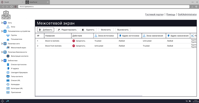 • создание и изменение групп IP-адресов, используемых для построения политик безопасности. В рамках базовой конфигурации заданы группы с IP-адресами бот-сетей и списком запрещенных веб-сайтов;