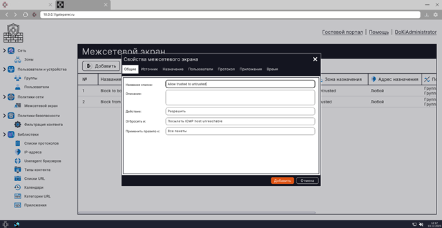 • добавление и изменение зон, используемых для группировки сетевых интерфейсов и определения политик сети и безопасности.