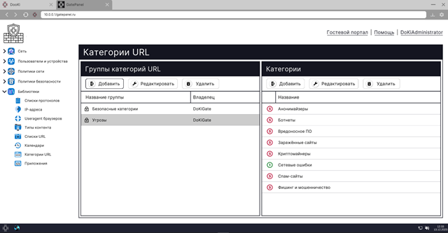 • создание и изменение списков категорий URL, для разбиения списков URL-адресов на группы категорий и упрощения построения политик сети и безопасности. В рамках базовой конфигурации заданы группы безопасных категорий и угроз;