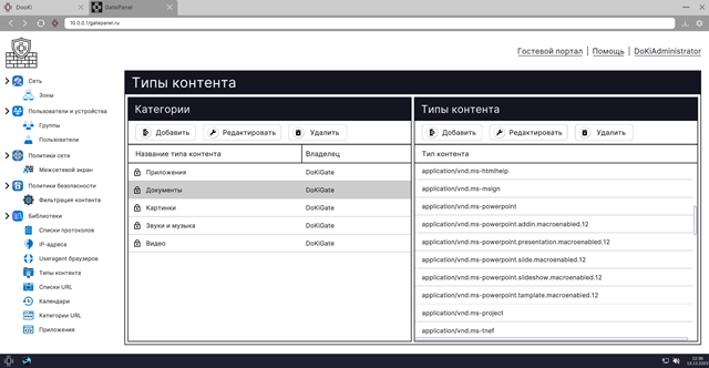 • создание и изменение правил для фильтрации контента. Заданные правила дают разрешение или запрет на определенный тип контента, передаваемый заданными способами;